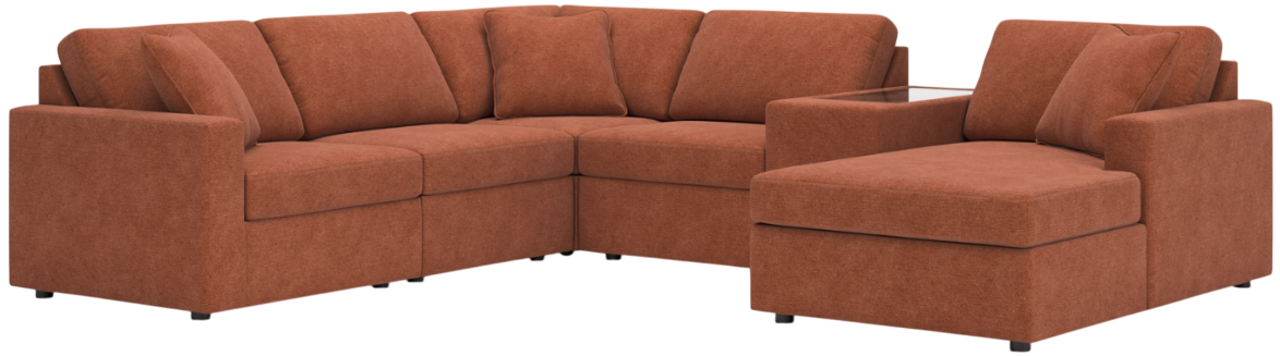 Includes 6 Modular Pieces: Left-arm facing corner chair, 2 armless chairs, console with storage, wedge and right-arm facing corner chaise