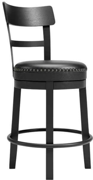 The bar stool seat is covered in a durable black faux leather designed for easy cleanup. Nailhead trim and metal accents perfect the aesthetic of this head-turning bar stool with 360-degree swivel.